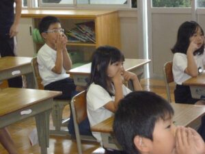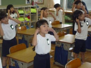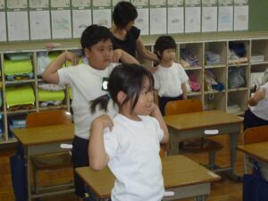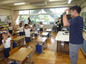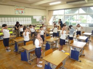 今日の2時間目、1年生ではALTの先生を迎えての英語の授業がありました。毎回、英語の授業は笑顔いっぱいに取り組みますが、今日も1年生はノリノリ。英語の歌に合わせて、自分の肩やひざ、目や耳をタッチしながら、英語での呼び方を楽しく覚えていました。