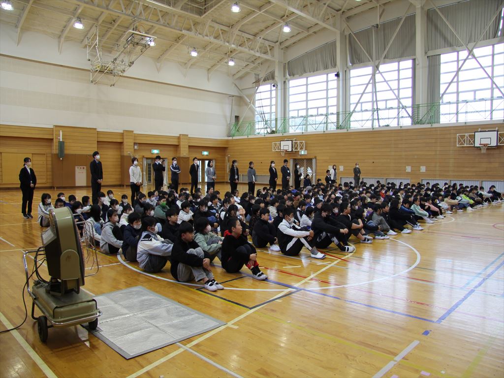 全校が体育館に集合し、姿勢を整え、82日間の2学期について振り返りました。