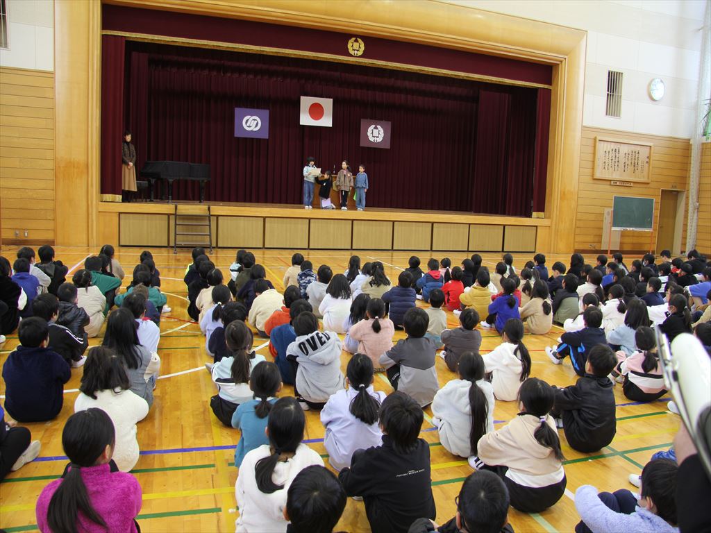 はじめに、2学期にがんばったことを、2年生代表児童2名と4年生代表児童2名が、ステージ上で話しました。4名ともに、はきはきとした口調で、全校児童にわかりやすく話すことができていてすばらしかったです。