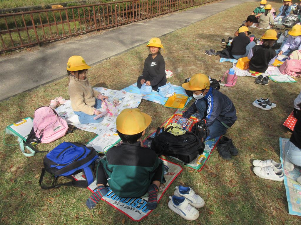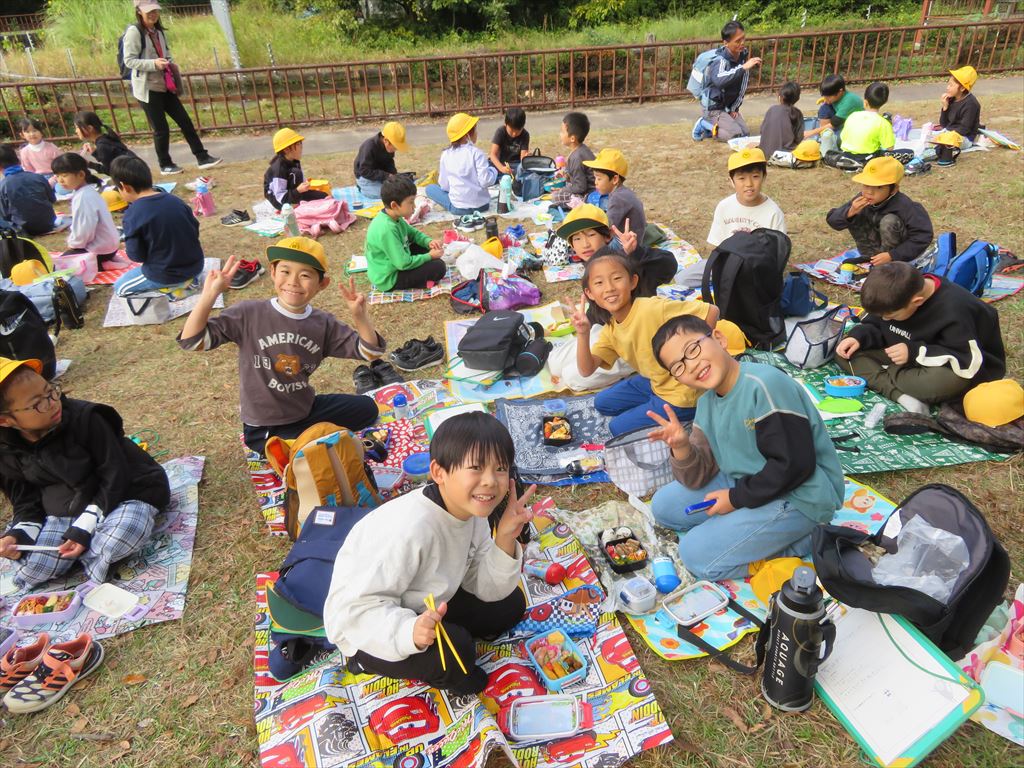 お昼は芝生の上でお弁当をいただきました。愛情たっぷりのお弁当にみんな笑顔でした。