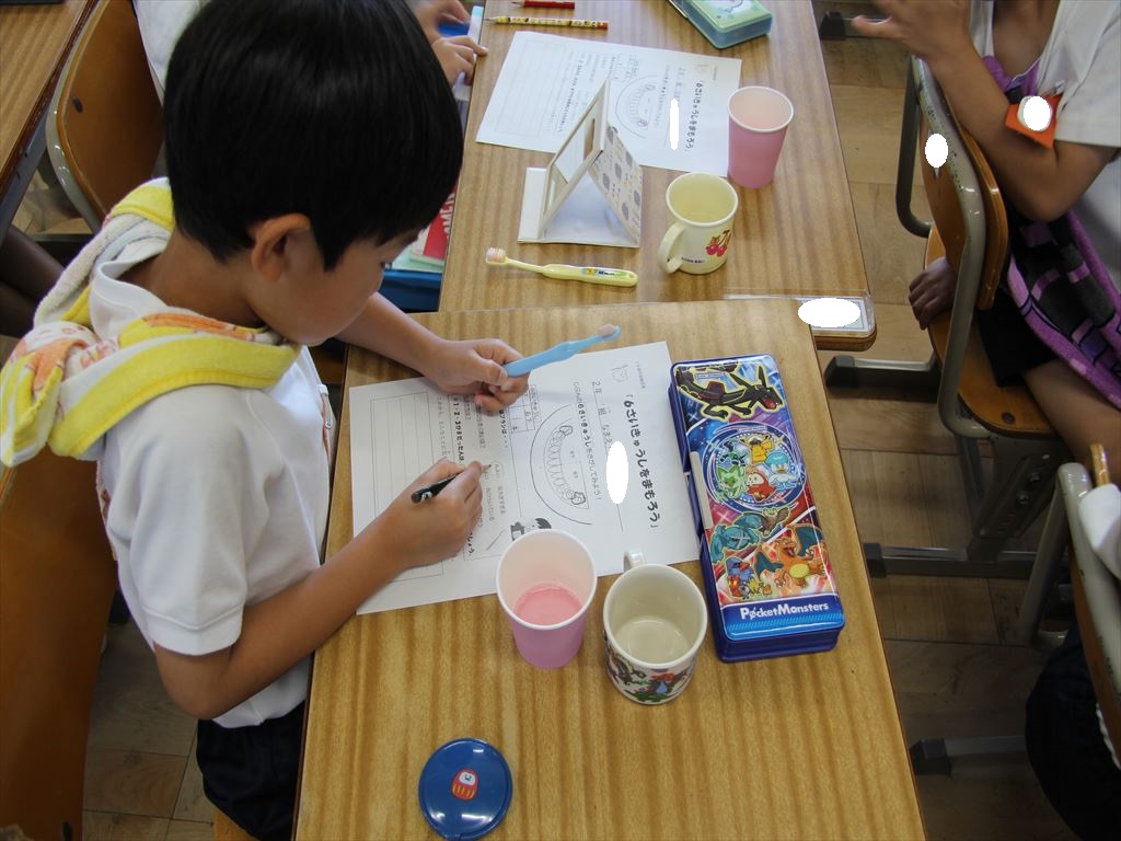 鏡を見ながら磨き残しがないか確認し、学んだことをプリントにまとめました。