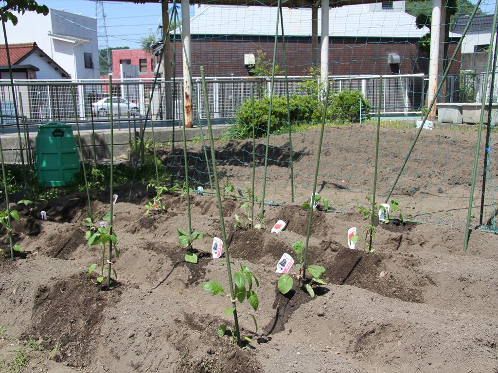 畑に穴を掘る、水をまく、苗を植える、など、役割分担してみんなで取り組みました。