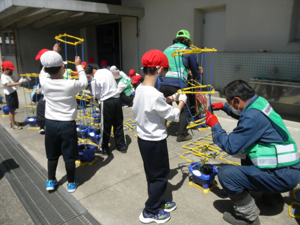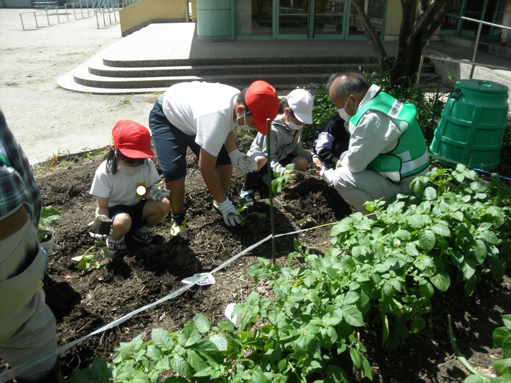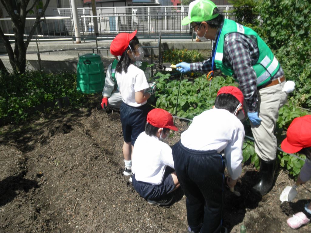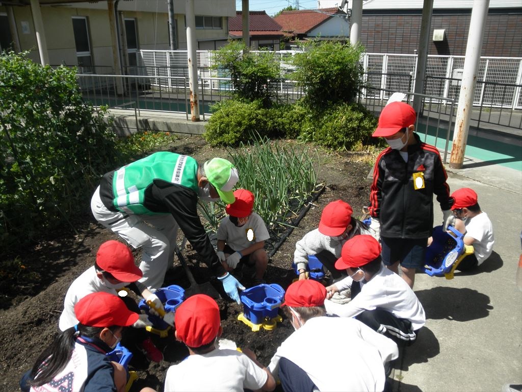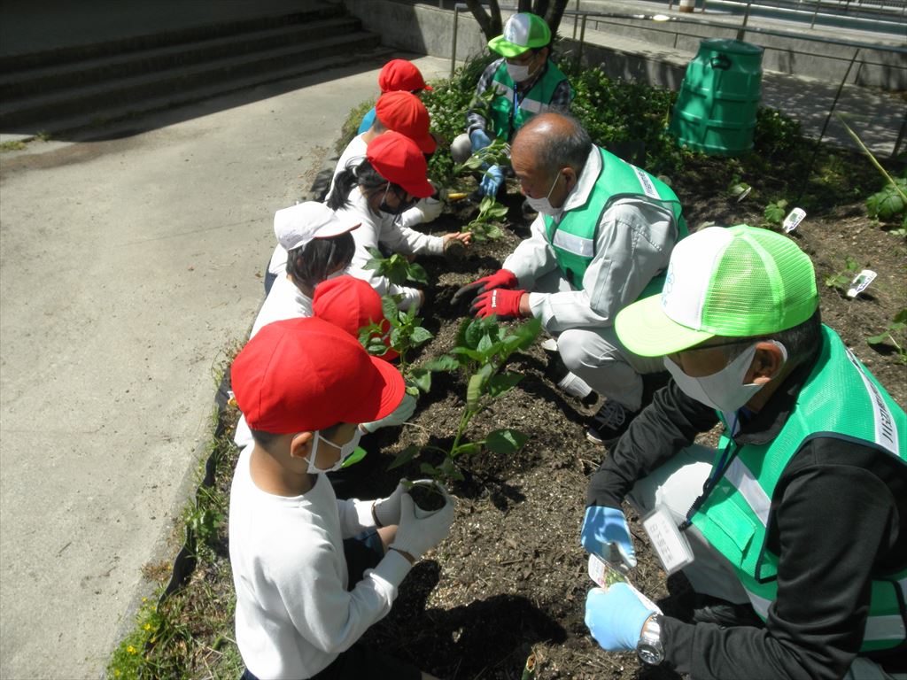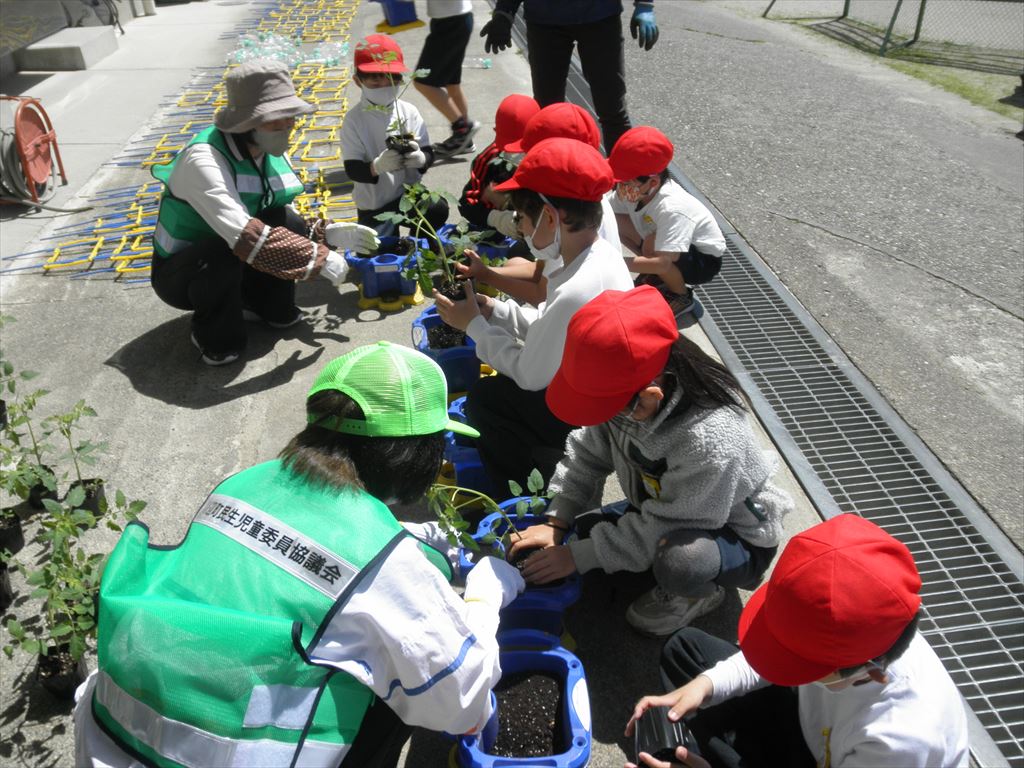 5月8日(月) 2年生が、主任児童委員・民生児童委員の皆様と一緒に野菜の苗植えを行いました。