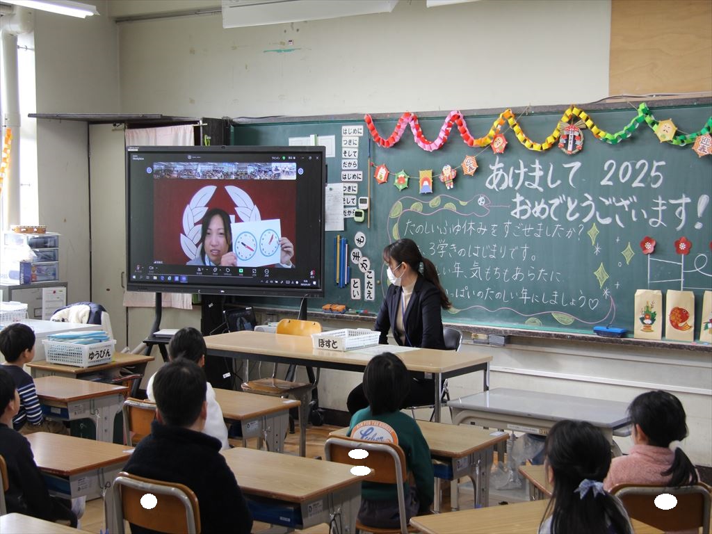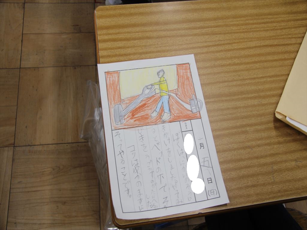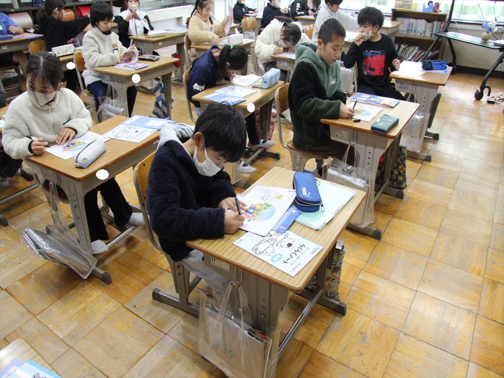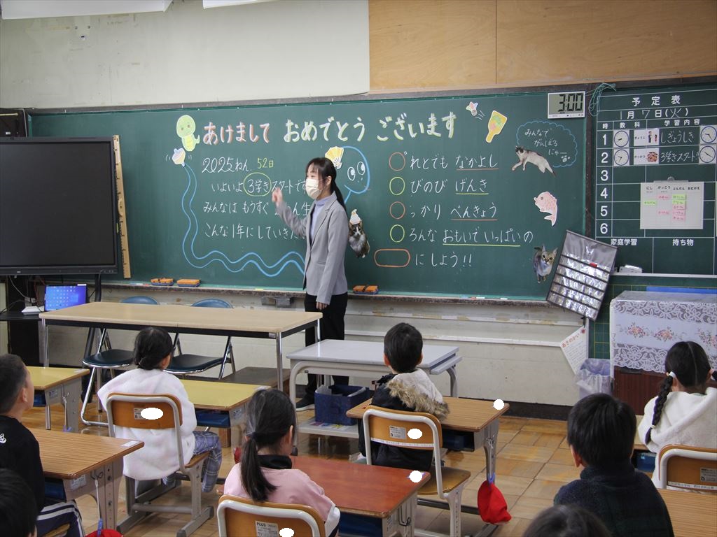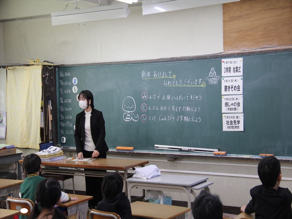 式の後は、学級活動を行いました。冬休みの宿題を提出したり、冬休み中の生活をみんなで振り返ったりしました。また、新しいドリルに名前も書きました。