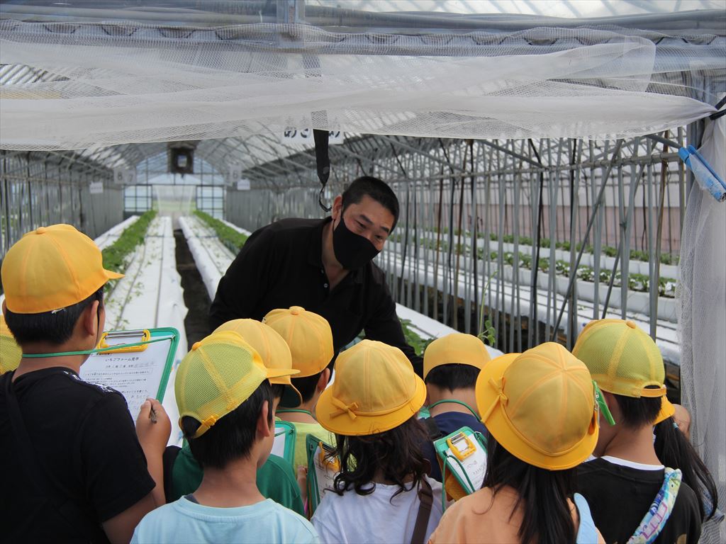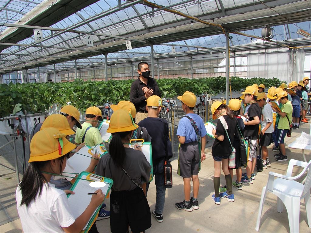 5月29日(水) 3年生が社会科の「農業の学習」と総合的な学習の時間の「自分たちの町を知る」の学習を兼ねて、「川辺いちごファーム」の見学に行きました。