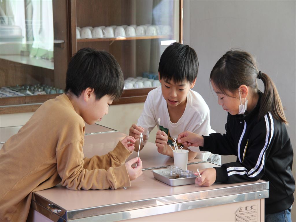 味の確認では「もろみ」「もろみをしぼった生のしょうゆ」「お店で売っているしょうゆ」のちがいを、実際に味見をして知ることができました。