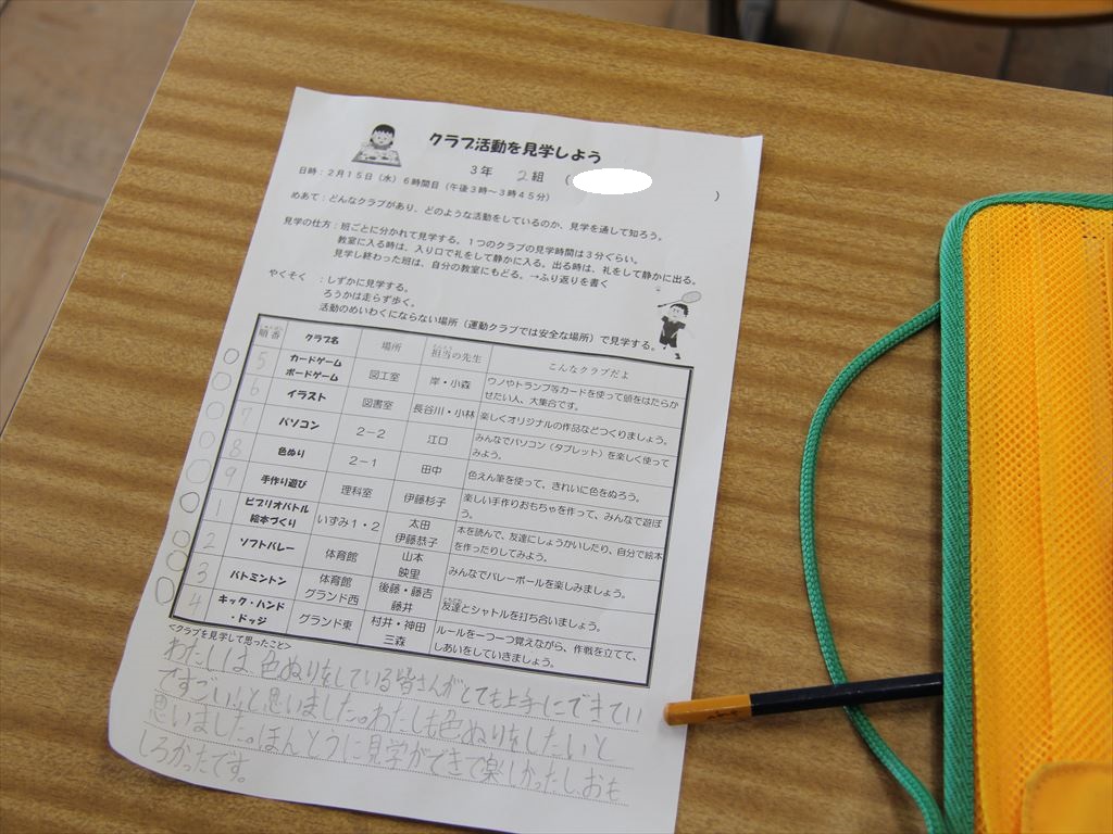 2月15日(水) 3年生がクラブ見学を行いました。
