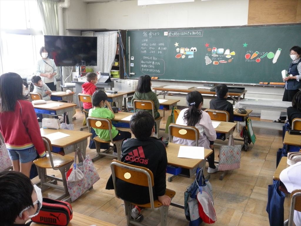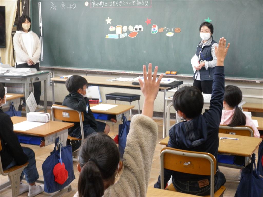 学校給食センターから栄養教諭の藤井先生にお越しいただき、「食べ物のはたらき」について考えました。