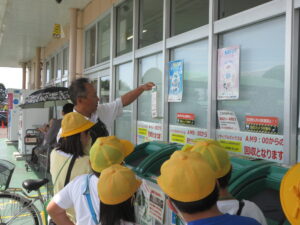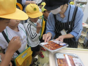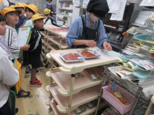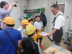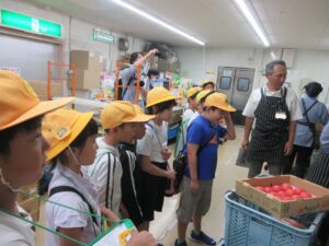 3年生は今までの社会の授業で、お店で働く人たちが、たくさんのお客さんに来ていただいたり、売り上げを増やしたりするために、様々な工夫をしていることを学習してきました。今日は川辺町にあるスーパーマーケット「ピアゴ」を訪ね、それらを実際に見学させていただきました。店長さんに話を伺ったり、普段は入ることのできないバックヤードに入れていただいたりしながら、今まで学習してきたことを確かめました。教室での学習を実際の生活とつなぐことで、子どもたちにとって生きた学びとなりました。