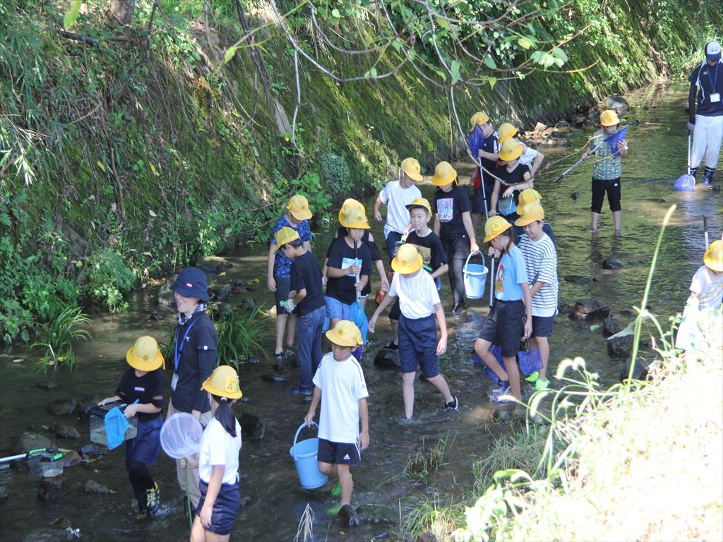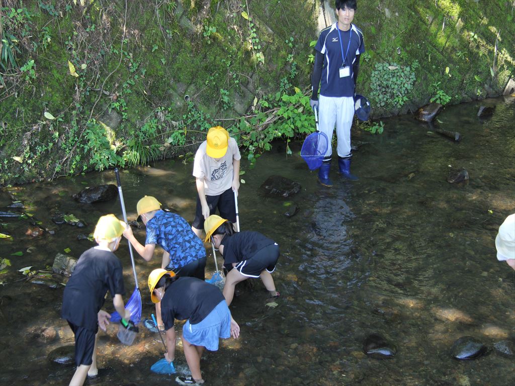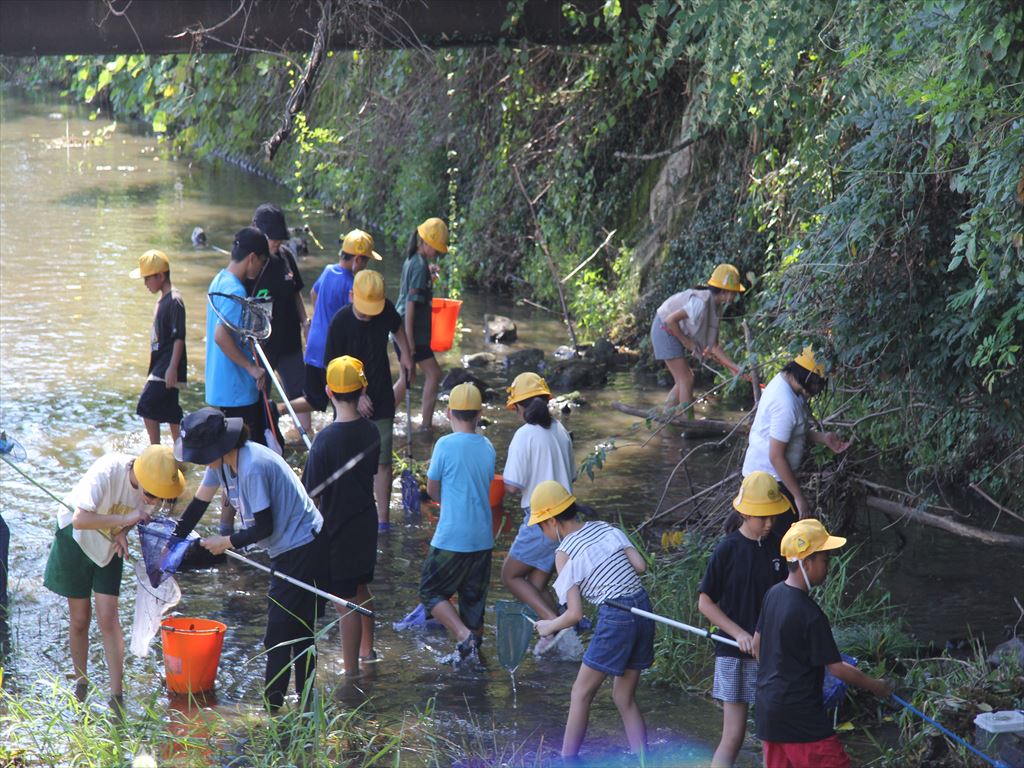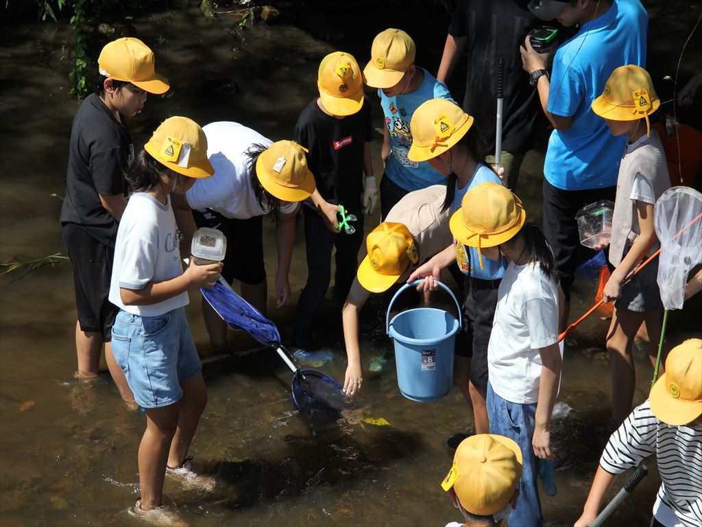まず、川の中に入り、各自が家から持ってきたタモ網を使い、水の中にいる生き物を捕まえました。