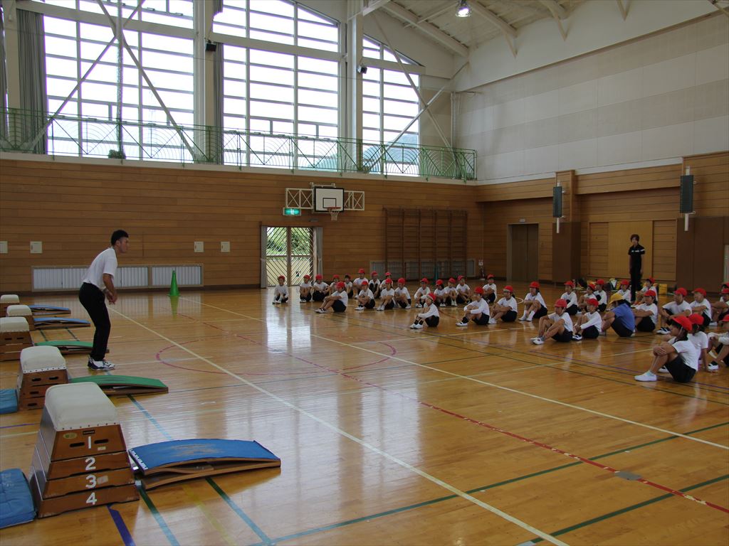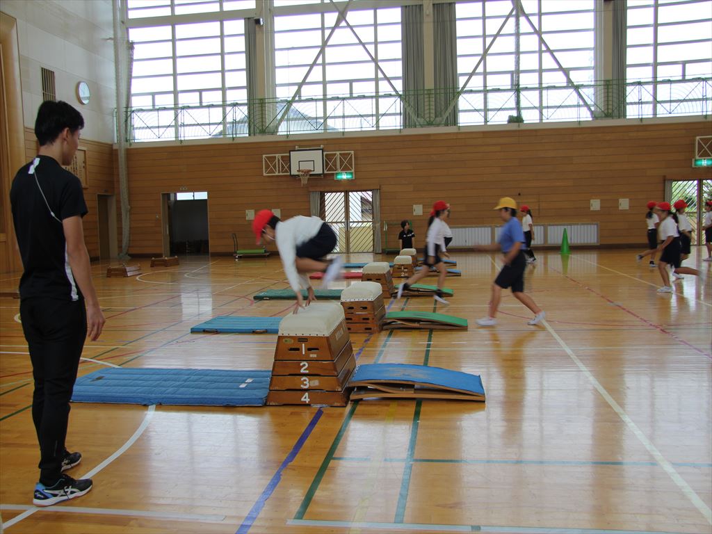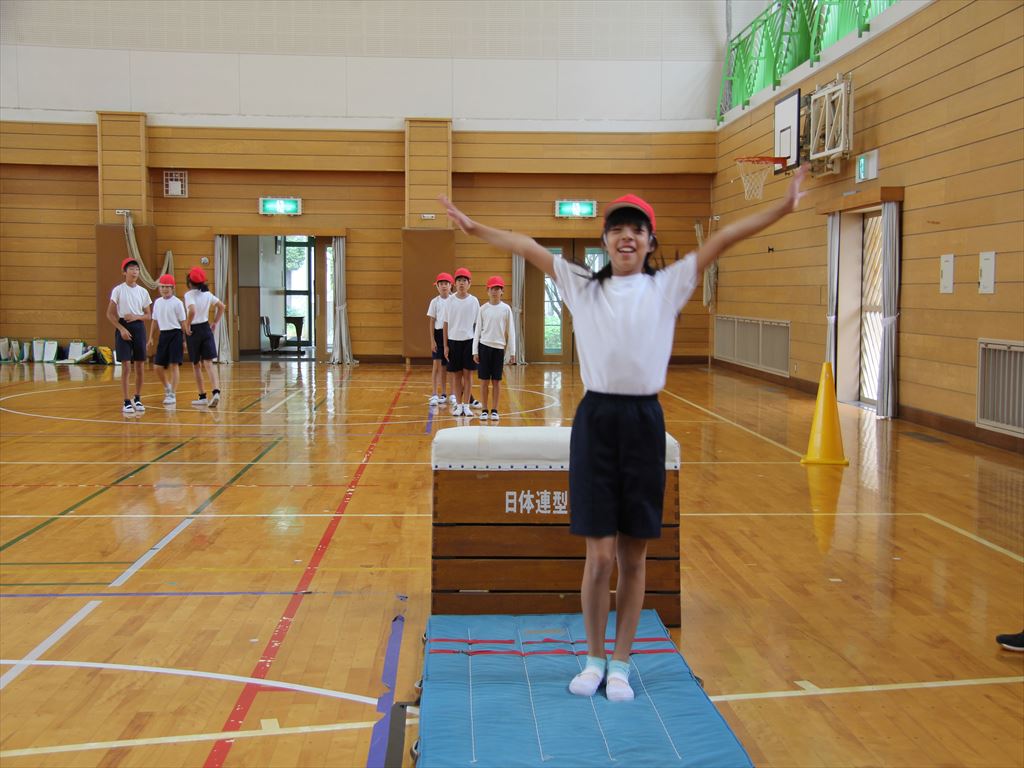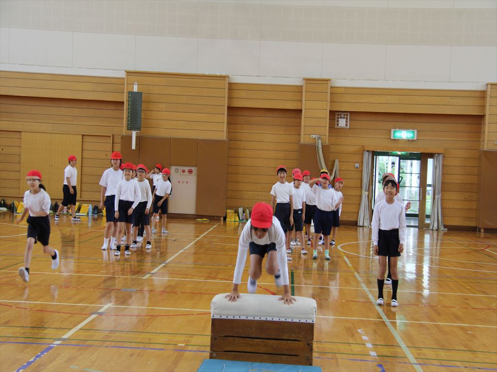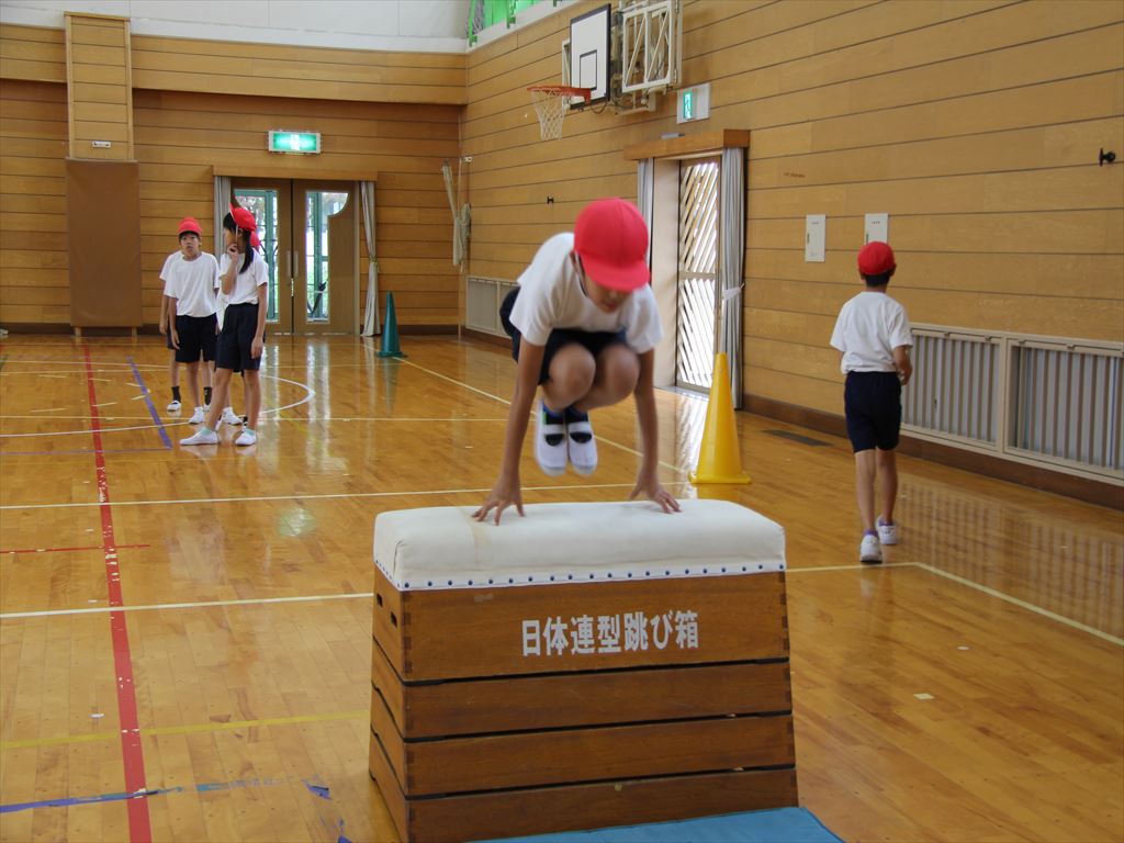 4年生の体育(跳び箱)で、かかえ込み跳びの練習をしました。
