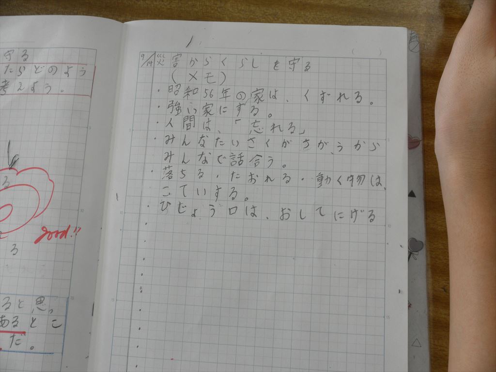 また、学校にいるときに地震が起きたら、どんな危険があるのか?上から落ちてくる可能性のあるものはどんなものか?など、さまざまな視点で自分たちの生活を振り返りながら考えました。