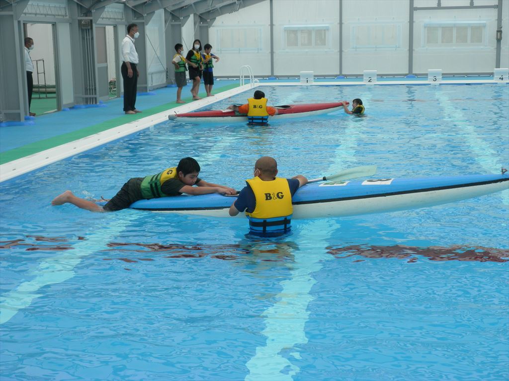 この体験は、6月23日(木)に飛騨川で行うカヌー体験の前に、万が一、カヌーが転覆したらどうするかを学ぶためのものです。