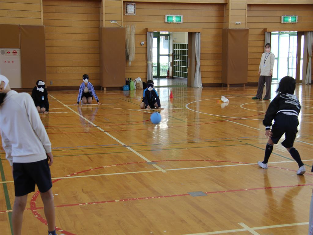 ゴールボールでは、鈴の音が近づいてくると、身体を横に倒して、チームみんなでゴールを守りました。