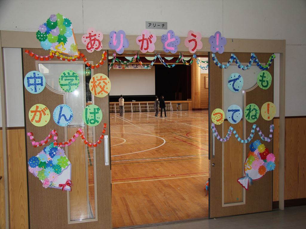 会場は全校で分担して飾りました。1年生は6年生の似顔絵を描きました。2年生は体育館入り口の飾りつけをしました。3年生と4年生は体育館の壁画を作りました。5年生は6年生の思い出をプレゼンテーションにまとめました。