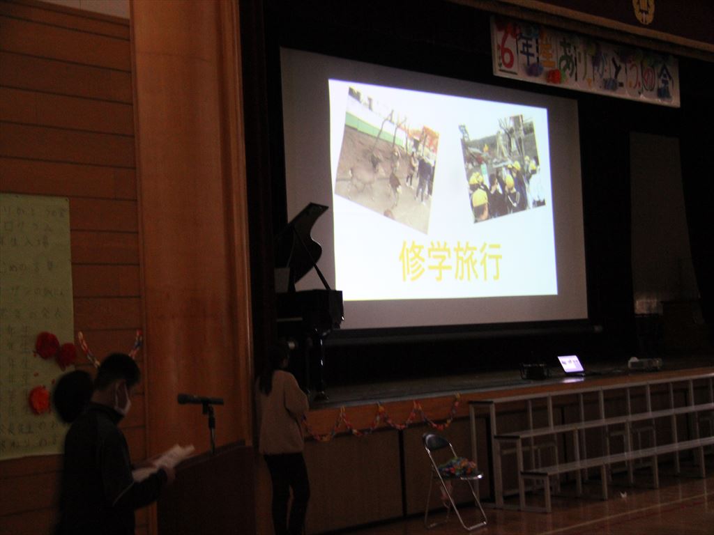 その後、2年生、3年生、4年生、1年生、5年生と順番に6年生との思い出を、呼びかけや歌、プレゼンで発表しました。1年生は6年生にメダルもプレゼントしました。