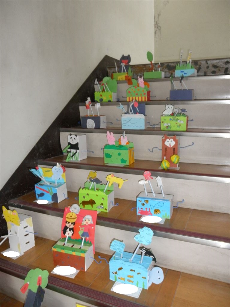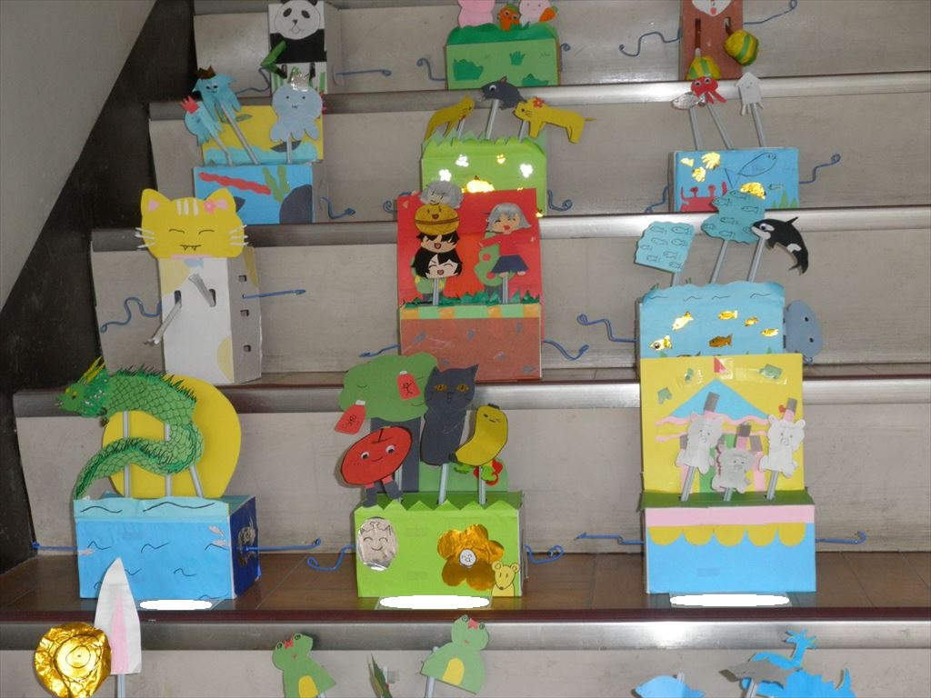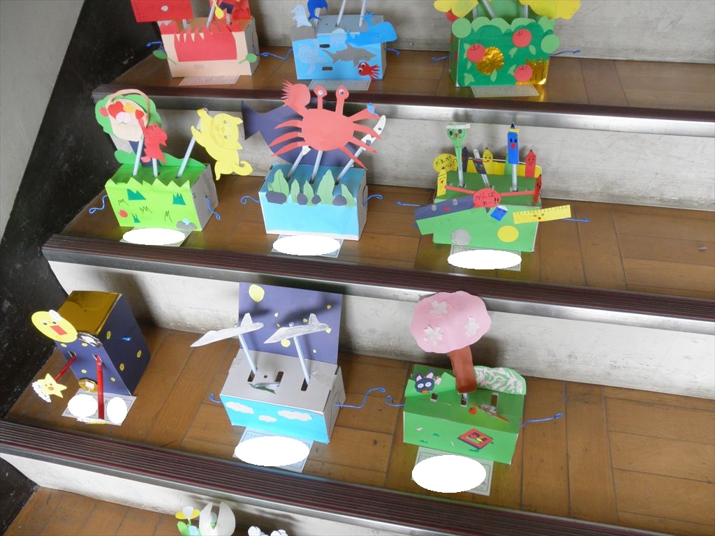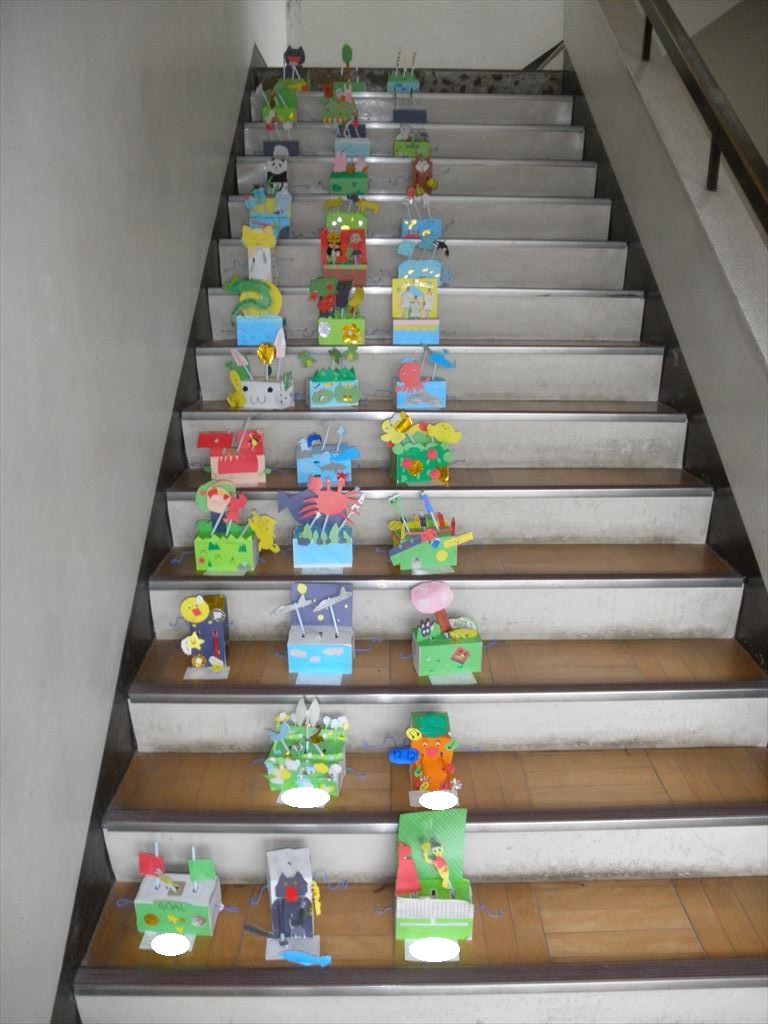 6年生の教室のそばにある使わない階段を利用して、6年生の図工の作品を展示しました。とっても素敵な作品です。ご覧ください。