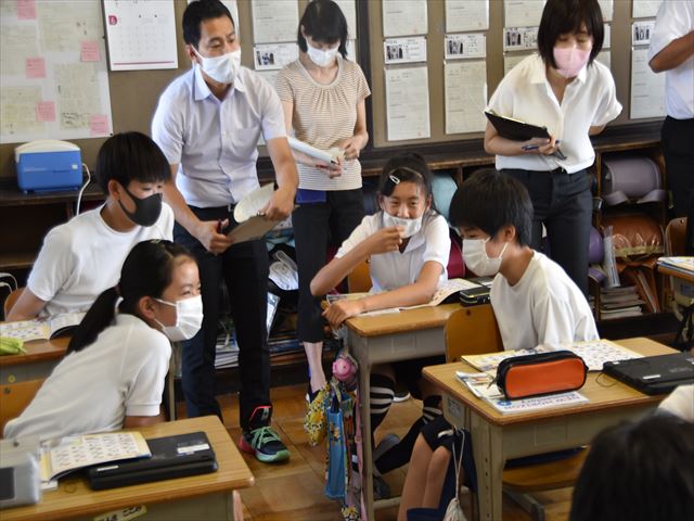 6年2組で全校研がありました。英語の授業を全校の先生が参観し、どのように学習を進めることがよいか検討をしました。自分の様子を録画し、発音を確かめている子どもたちが印象的でした。