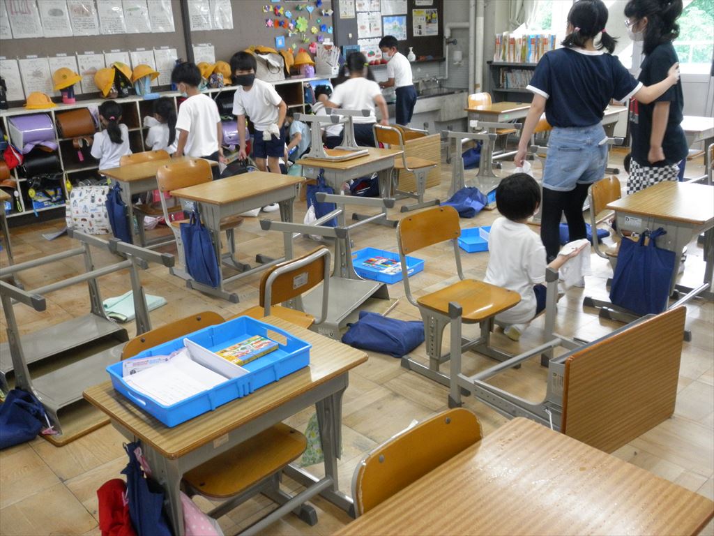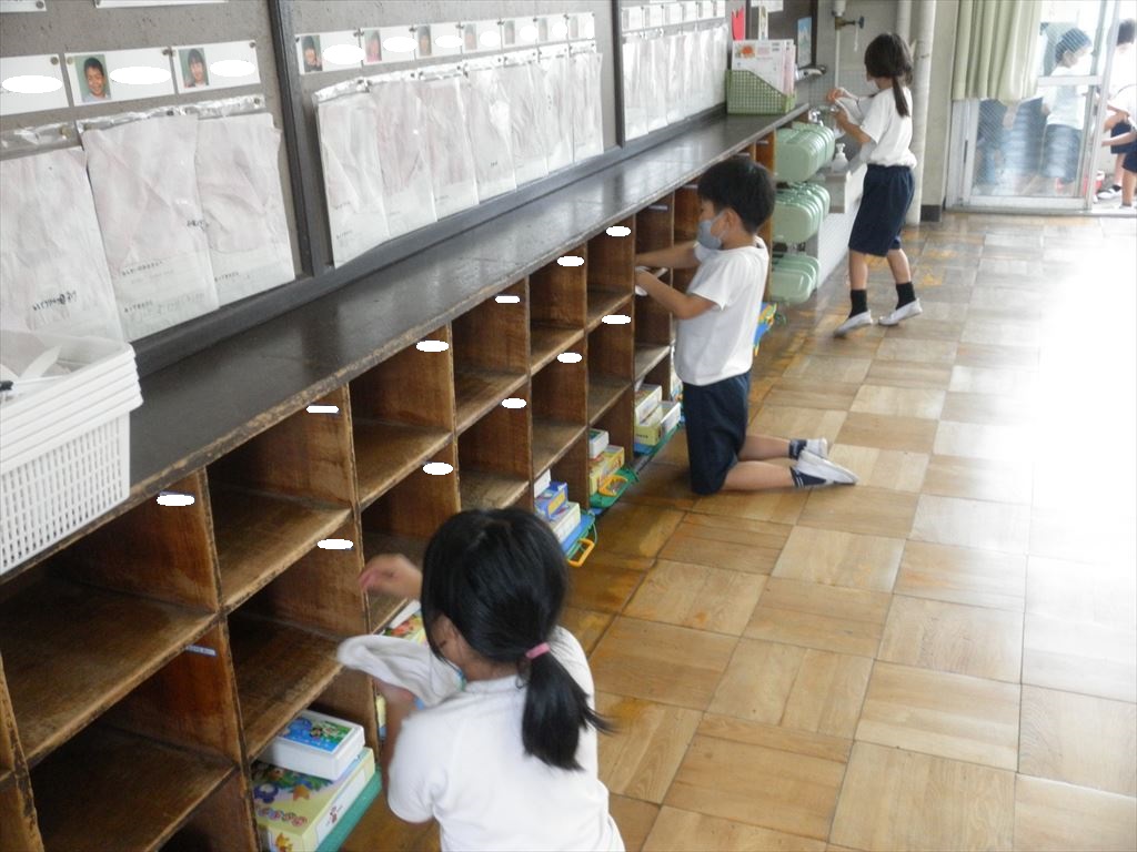 1学期間使った机やイスの脚についたホコリを丁寧にとり、机とイスを廊下に出しました。低学年の教室には高学年のお兄さん、お姉さんが手伝いに行ってくれました。