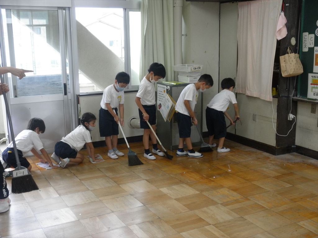 机やイスのない教室の床を、ほうきとぞうきんで掃除しました。