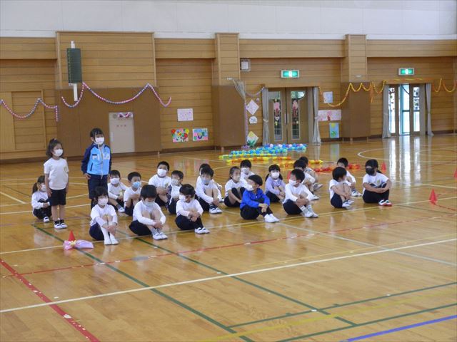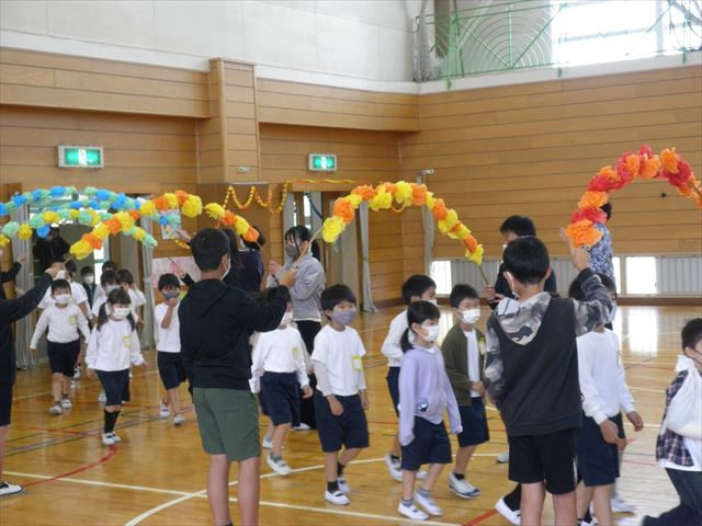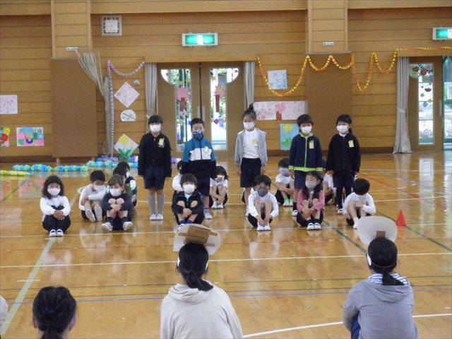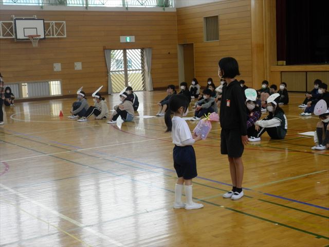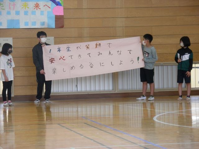 1年生を迎える会もいよいよ最終日となりました。今日は6年生の担当です。昨夜の雨で運動場の状態が良くないため、今日の会は感染対策を講じながら体育館で行いました。