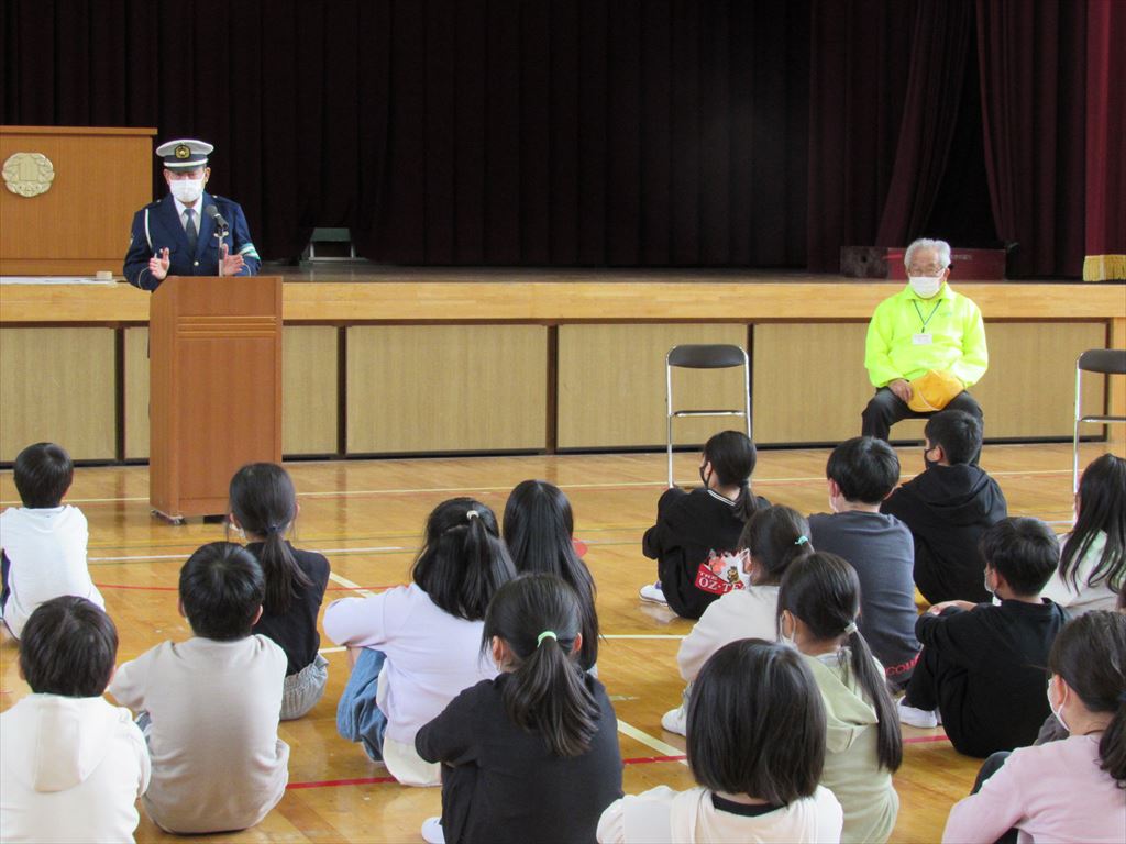 4月24日(月)の5時間目に、交通少年団入団式を行いました。入団式は4年生全員と6年生の代表児童が体育館に入り、それ以外の児童は教室からリモートで参加しました。