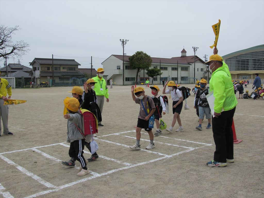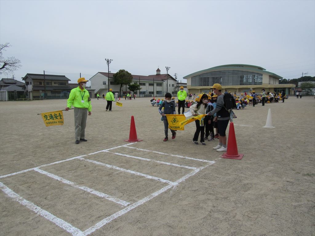 下校の時には、運動場で横断歩道の渡り方の確認後、加茂郡交通安全協会川辺支部の皆さんに下校の様子を見届けていただきました。