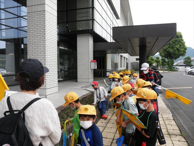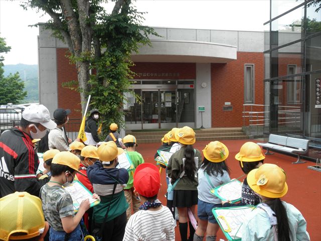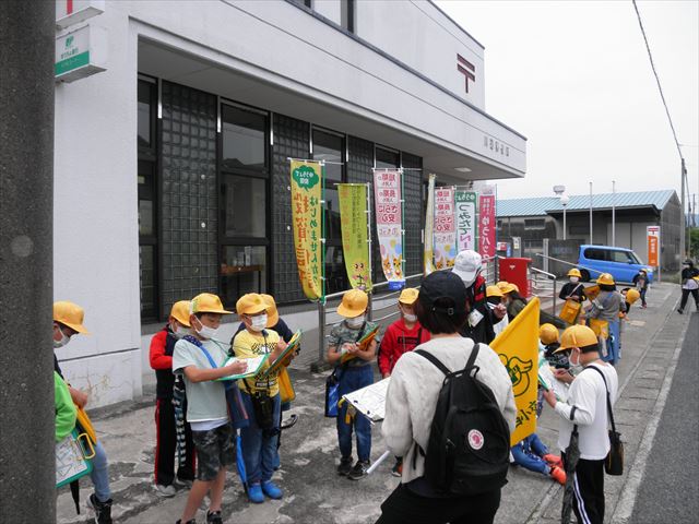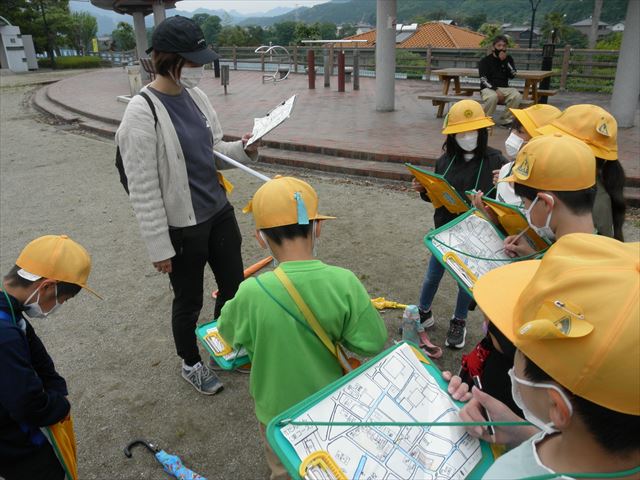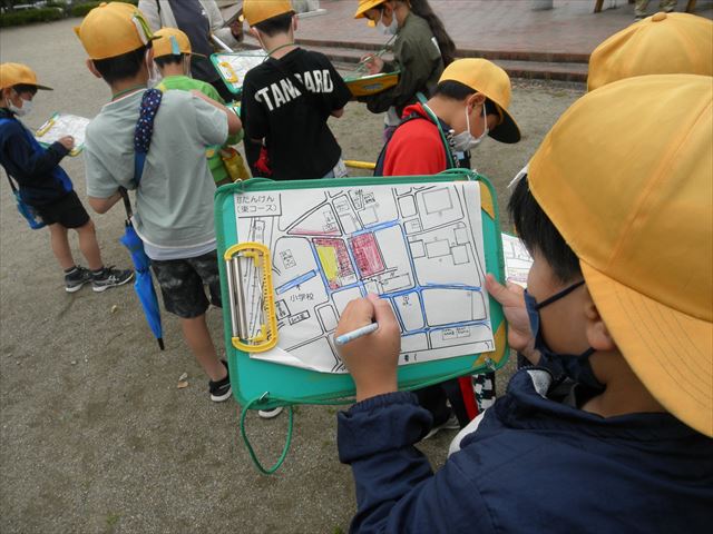 5月17日(火)の3,4時間目に社会科の学習で、3年生が町探検に行きました。今回は西小学校の東側を回る東コースです。東光寺公園や郵便局、町役場、白扇酒造などを見て回りました。