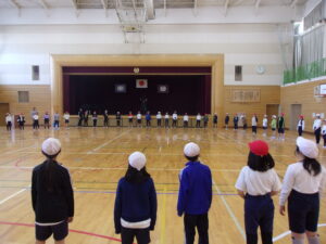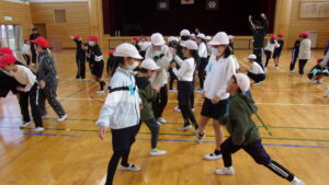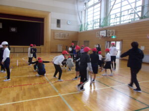 4年生が、川辺西小学校で行われた「4年生・町小学校交流会」に参加しました。一緒に歌を歌ったり、講師の方のご指導を受けながら仲良く楽しくACP(子どもが発達段階に応じて身につけておくことが望ましい動きを、様々な運動遊びを通して楽しく習得できるプログラム)を行ったりしながら、交流を深めることができました。