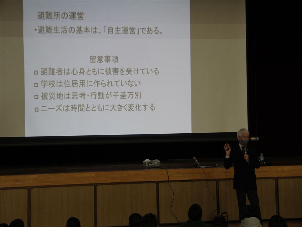 学校が避難所になったときには、受け身になるのではなく、自分たちにできることを考えて動くこと。また、災害発生時に限らず普段の生活の中で、いろいろな立場の人たちのことを考えて生活することが大切だと学ぶことができました。