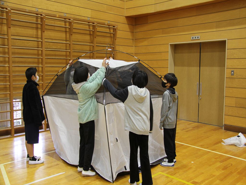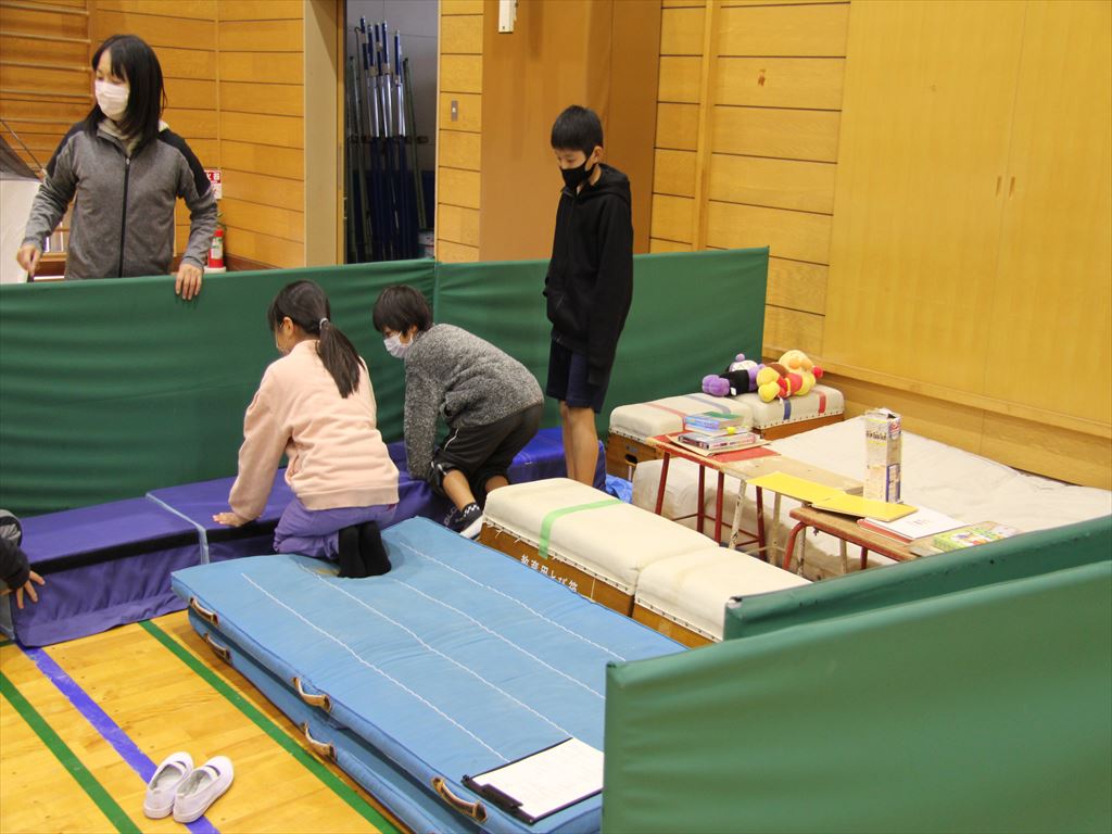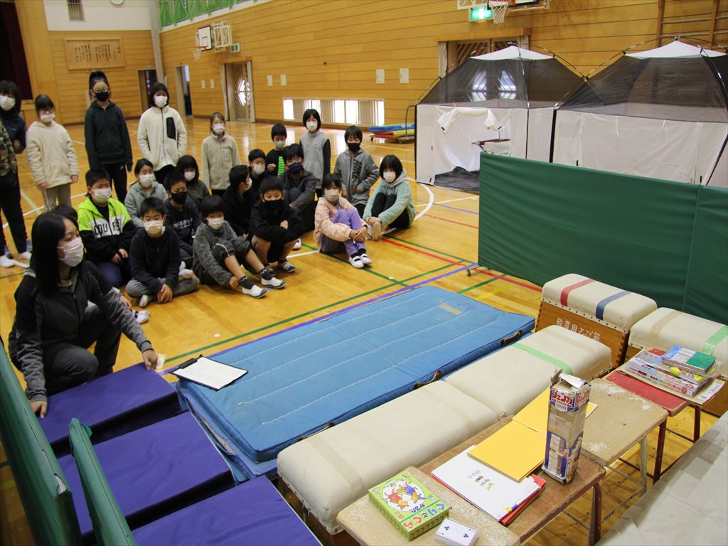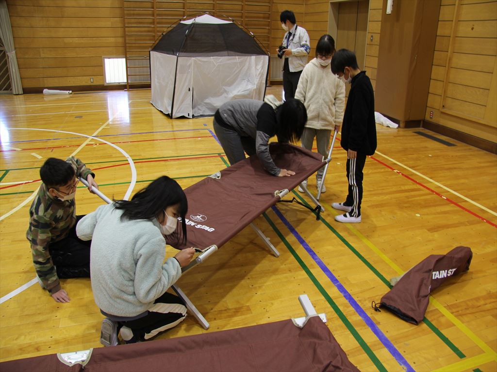 まず簡易テントとベッドをみんなで協力して作りました。その後、クラスごとに分かれて、小さな子どもたちが生活しやすい空間、高齢者の生活しやすい空間について考え、学校の体育館にあるものを使い、それぞれのコーナーを作りました。